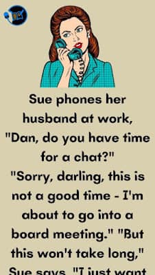 Sue phones her husband at work, “Dan, do you have time for a chat?”“Sorry, darling, this is not a good time – I’m about to go into a board meeting.”