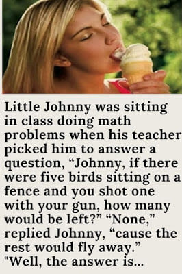 “Johnny, if there were five birds sitting on a fence and you shot one with your gun, how many would be left?”