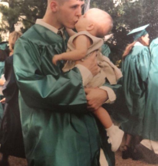 Dennis had the joy of having his infant daughter, Tori, present for his own high school graduation in 2000. In that moment, they posed for a priceless snapshot where Dennis kissed his daughter, capturing the essence of his special day.