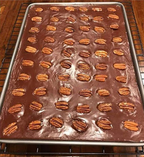 6. Spread or pour the warm frosting over the cake. While the cake is still warm, sprinkle with chopped pecans, and chocolate chips. Drizzle with caramel sauce.