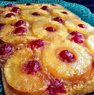 Preheat oven to 350. In 13×9 inch pan, melt butter in oven. Sprinkle brown sugar evenly over butter. Gently press pineapple slices on brown sugar. Gently press a cherry in center of each pineapple slice, and arrange remaining cherries around slices.-Add enough water to reserved pineapple juice to measure 1 cup. Make cake batter as directed on box, substituting pineapple juice mixture for the water. Pour batter over pineapple and cherries.