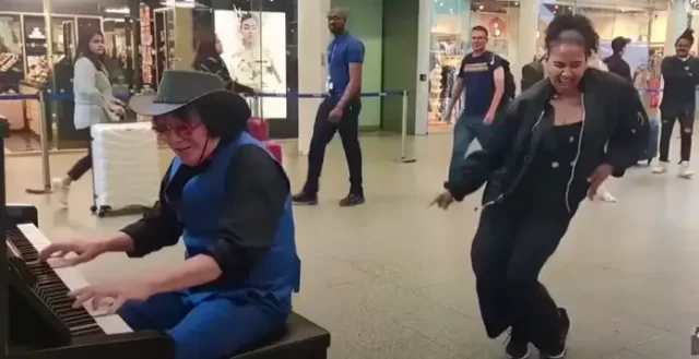 There’s something truly enchanting about the spontaneous magic that can occur in public spaces. In the video featured below, a remarkable instance of such magic unfolds. Renowned street performer Terry Miles is seen playing a public piano in a bustling London train station. As he skillfully belts out his boogie woogie tunes, a woman with a backpack happens to walk by. Captivated by the rhythm, she begins to dance, eventually setting aside her backpack to fully immerse herself in the music.